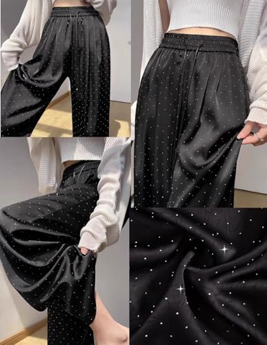 • Crystal embellishment decoration trendy pants ;Satin silky flowy wide leg pants for women elastic waistband casual relaxed loose fit slacks baggy pants with drawstring