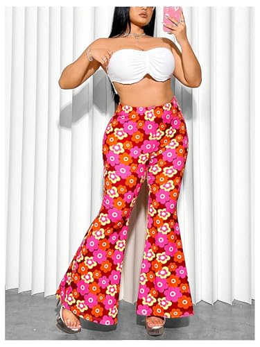 HOT ! OYOANGLE Women's Plus Size Boho Floral Print Flare Pants Elastic High Waist Skinny Bell Bottoms