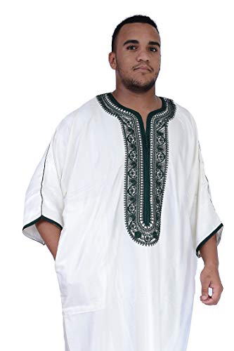 HOT ! Moroccan Men Kaftan Handmade Thobe Long Gown White With Delicate Green Embroidery