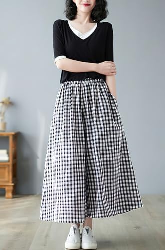 chouyatou Women's Summer Casual Cotton Linen Pants Culottes Plaid Gingham Wide Leg Capri Palazzo Pants 7