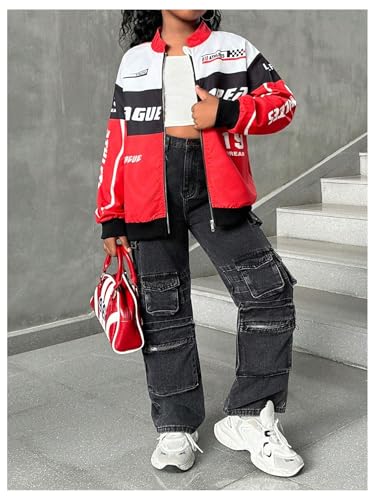 More information about WDIRARA Girl's Color Block Zip Up Bomber Jacket Letter Graphic Long Sleeve Outerwear