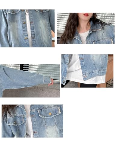 • Basic button down jean jacket, raw edges embellish the lapel and pockets, classic and fashion. Button design, flexible to put on and take off, loose and comfortable. Match with dresses or other clothes, the style is versatile and increase the wearability.