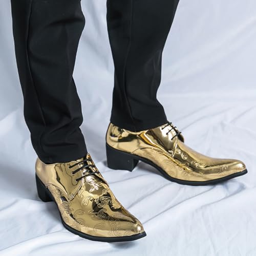 Men's Printing Pointed-Toe Patent Leather Derby Oxford Shoes,Classic Lace-up Low Top Block High Heel Fashion Slip on Prom Business Wedding Dress Shoes 6