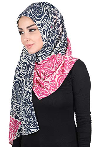 Aisha's Design Chiffon Hijab Scarf for Women Muslim, Presewn Instant Turban Shawl, Navy Blue - Fuchsia 1