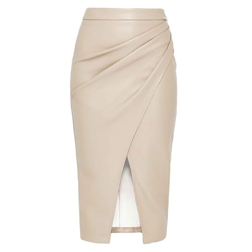 HOT ! Women's Vintage Faux Leather Midi Skirt High Waisted Wrap Ruched Front Slit Zip Back Bodycon PU Pencil Skirts