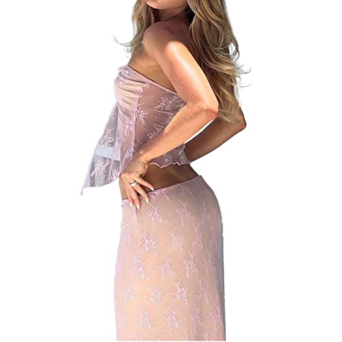 HOT ! Gupgi 2 Piece Lace Long Skirt Outfits for Women Lace Mesh Long Sleeve Off Shoulder Crop Tops Sheer Lace Floral Skirt Set