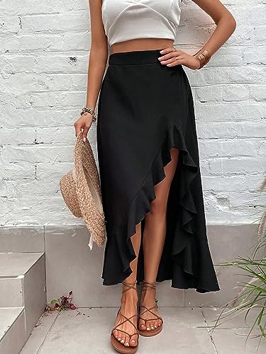 HOT ! ELDINA Women's Summe Casual Maxi Long Skirt High Waist Ruffle Trim Slit Hem Skirt (Color : Black, Size : X-Small)
