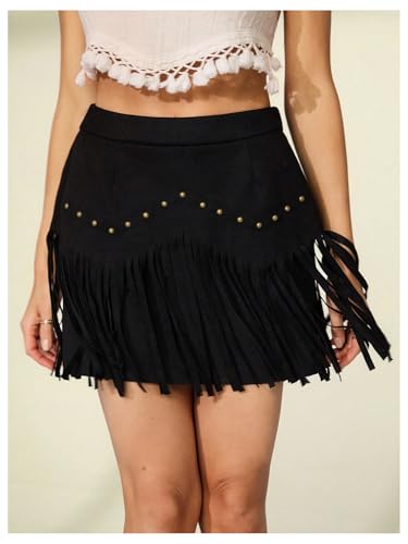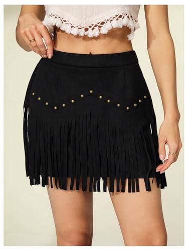 • Tassel western mini skirts, fringe hem, faux suede, retro hippie studded, tassell, high waist, solid color, bodycon, zipper fly