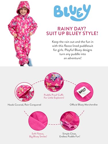 • Playful and Fun All-Over Bluey Print: Featuring a charming all-over print of Bingo and Bluey, this fleece-lined Bluey girls raincoat will keep your little adventurer stylish and dry all day long