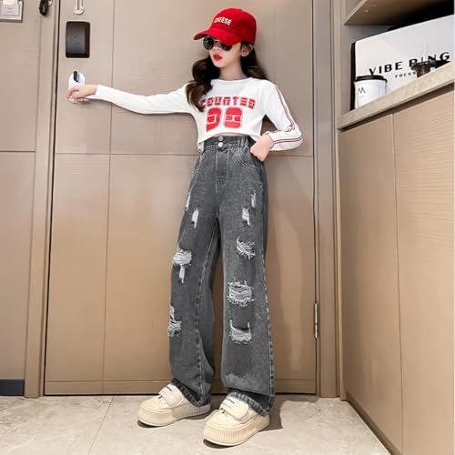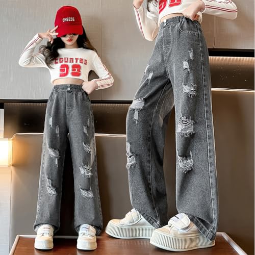 Girls Ripped Wide Leg Jeans Denim Elastic Baggy Kids Button Jeans Casual Pocket Pants Age 5-14 5