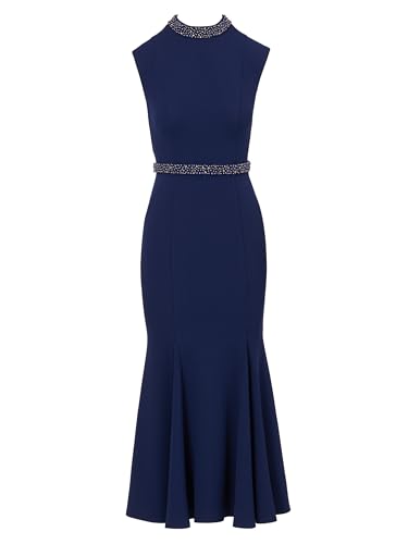 • This is an ankle length dress made out of a solid knit crepe fabric with an extended shoulder mock neckline and waistband with beaded trim, skirt with godets, and zipper at the center back