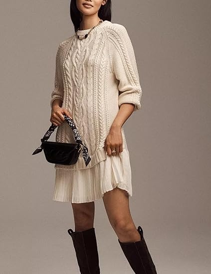 • Features: This loose fit tunic cable knit sweater dress women cleverly combines oversized sweater top with tiered pleated hem design, looking cute and trendy. This twofer style cable knit mini dress for women features in a crew neck, long sleeve, mini length, cable knit and loose fit designs, which are suitable for most people
