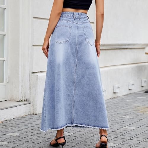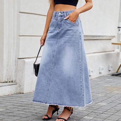 More information about Women's Vintage Denim Maxi Skirt Casual High Waist A-Line Frayed Hem Trendy Fashion Long Jean Skirt with Pockets