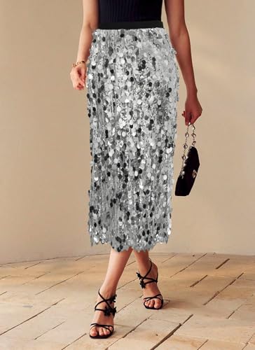 Womens Sequin Skirt Elastic Waist High Waist A line Sparkly Shiny Midi Concerts Night Out Club Party Skirts 4