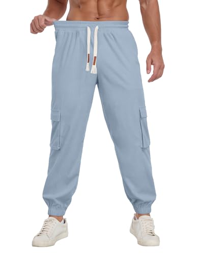 HOT ! Askdeer Mens Corduroy Joggers Pants Casual Cargo Pants Drawstring Elastic Waist Baggy Tapered Sweatpants with 5 Pockets Light Blue