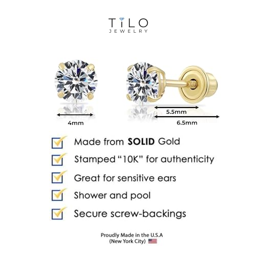 HOT ! 10k Yellow Gold Solitaire Round Cubic Zirconia Stud Earrings in Secure Screw-backs