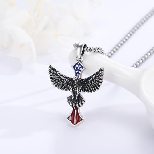 HOT ! Eagle Necklace for Men 925 Sterling Silver American Flag Cross Necklace American Eagle Cross Patriotic Pendant Independence Day Jewelry for Men Women