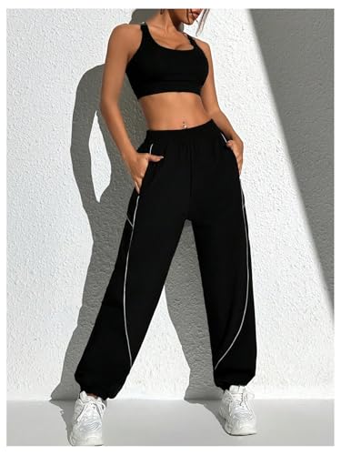 HOT ! OYOANGLE Women's Cargo Pants Striped Elastic Waist Workout Athletic Jogger Trousers with Pocket
