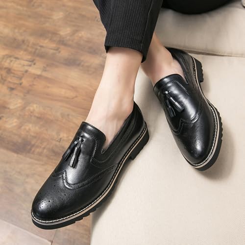 • Retro Brogue Loafers with Tassels: Men's slip-on dress loafers featuring classic brogue detailing and stylish leather tassels. Round toe design offers comfort and a timeless look.