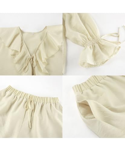 • Feature: 2 piece outfit set for women, v neck, tie front, layered ruffle trim, adjustable drawstring cuffs, high waist shorts, 2 piece lounge sets