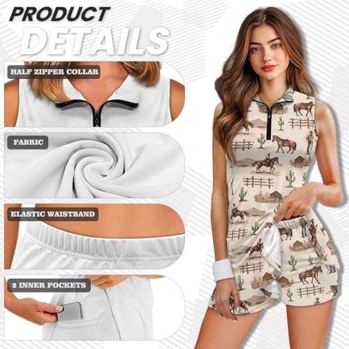 • Athletic Workout Dresses for Women Features: 2-piece set. Sleeveless golf dress with collar, quarter zip pullover, tennis golf dresses with built in shorts, sports wear dress, exercise activewear dress, sun protection pullover. Golf dresses comes with the matching separate shorts with pockets that are appropriate for a tennis or golf ball. 4-way stretch for unrestricted movement, slim fit but not too tight, you can move freely during exercise
