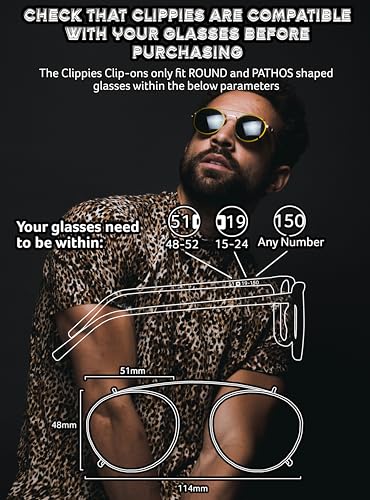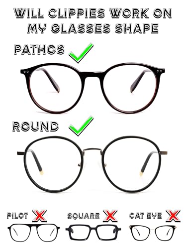 • Clip on Sunglasses Over Prescription Glasses – Perfect Fit Every Time: Measure your glasses and check our detailed fitting guide image to ensure your Clippies fit snugly over your frames. Works for clip-on sunglasses for women and clip on sunglasses mens, including round and Pathos shapes. Avoid returns and enjoy sunglasses that fit over glasses comfortably.
