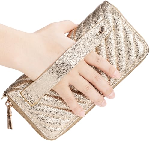 B BRENTANO Vegan Leather Double Zipper Pocket Wallet with Grip Hand Strap (GOLD GLITTER) 6