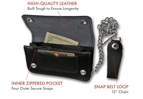 Black Bi-Fold 7 inch Leather Biker Wallet With Snap Belt Loop 1