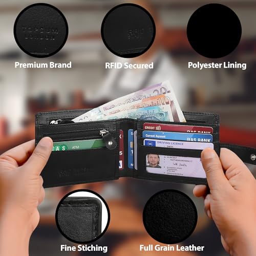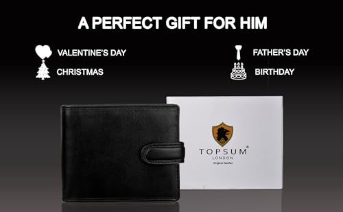 • This Topsum London Luxury wallet is manufactured with a high quality genuine Vegetable Tanned black leather and layered with RFID blocking technology, RFID blocking bi-fold wallet is classic but elegant, protecting valuable information on ID cards and Credit cards from electronic pick-pocketing. Best gifts for him on Valentine's day, Birthday or Festivals.