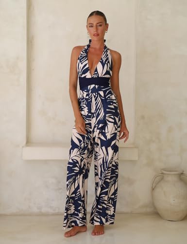 FLAXMAKER Women's One Piece V-Neck Adjustable Halter Leaf Print Bathing Suit Swimsuit and Skirt/Pants 1