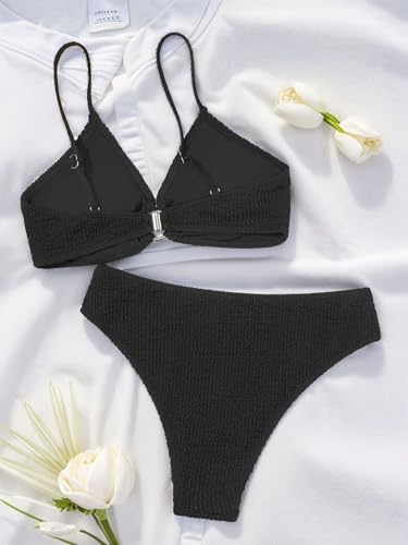 • Design: Adjustable spaghetti straps bikini top, O-ring linked front, removable push up padded cups, offers great support and enhance your shape. clasp closure at back, fashion ribbed textured mid waist cheeky bikini set giving you a chic look.