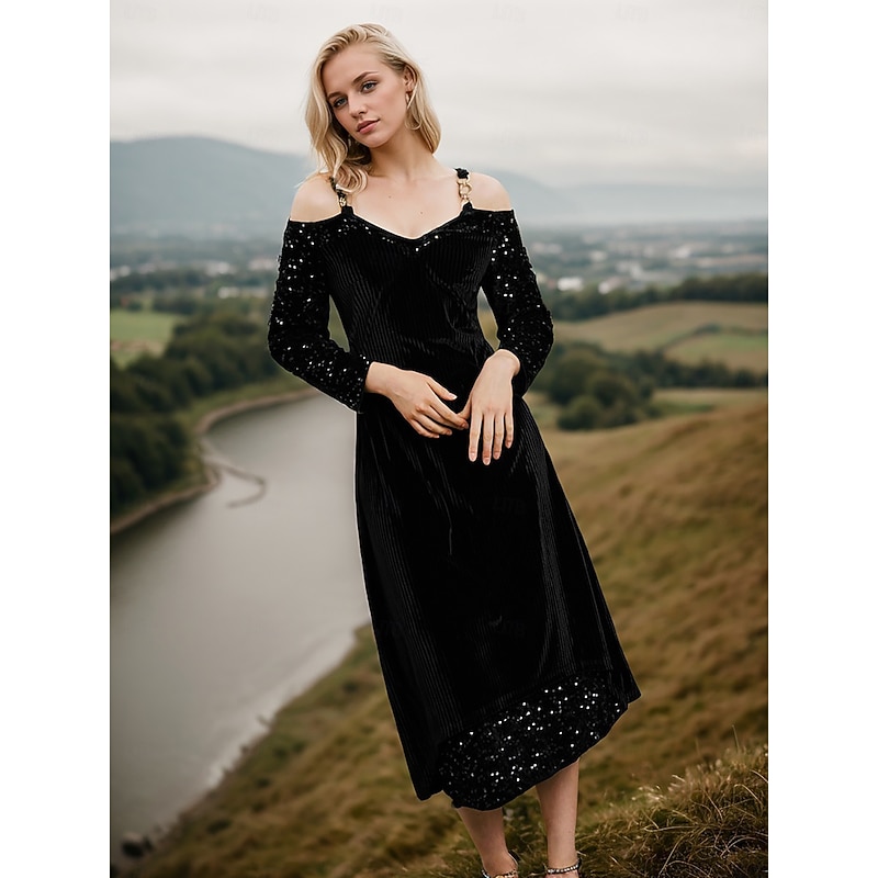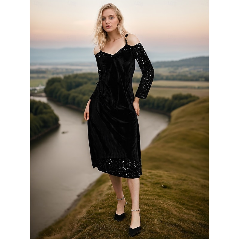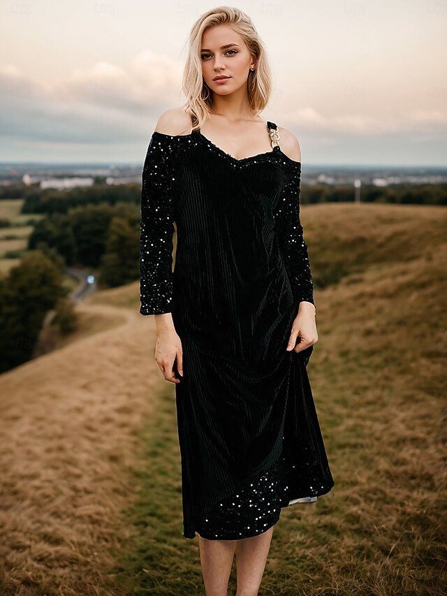 Highlights - Perfect for the winter season - Long sleeves for added warmth - Specifically designed for women - Suitable for various occasions such as vacations, Christmas, birthdays, and being a wedding guest - Can be worn as a winter dress - A stylish and elegant party dress - Made of luxurious velvet fabric - Timeless and sophisticated black dress - Ideal for semi-formal events - A classic cocktail dress - Features a sparkling design - Flattering V-neckline - Falls at a midi dress length