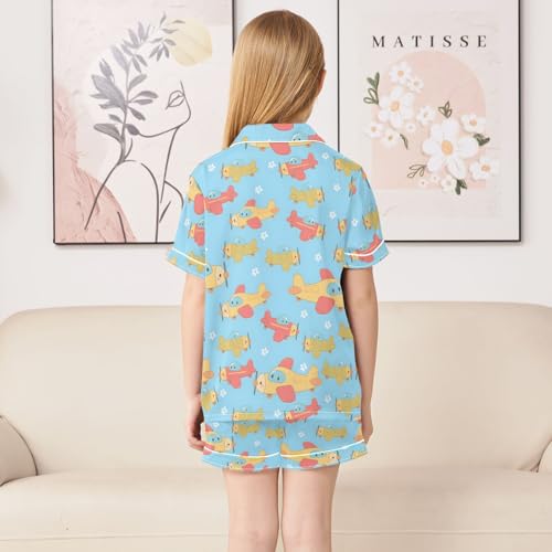 Aircraft Cartoon Pattern Summer Pajamas Set Soft Satin Pjs Sets 2 Piece Short Sleeve Sleepwear Casual Clothes 5