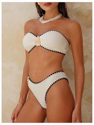 • Feature: 2 Piece Set, Contrast Binding, Metal Decor, Strapless, Sleeveless Bikini Top and High Rise Bikini Bottoms for Women