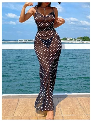 SHENHE Women's Sexy Polka Dots Dress Sheer Mesh Draped Front Open Back Swimsuit Beach Cover Up Maxi Dresses 1