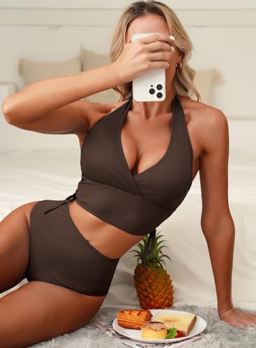 More information about Herseas Women 2 Piece High Waisted Bikini Set V Neck Halter Drawstring Sides Ruched Swim 2025 Summer Bathing Suit