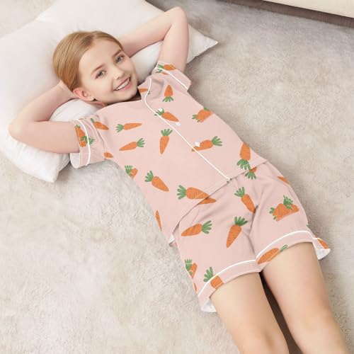 Satin Pajama Sets Short Sleeve Carrot Pattern on Pink Button Down Silky Nightwear 2 Piece PJS 5-14Y 6