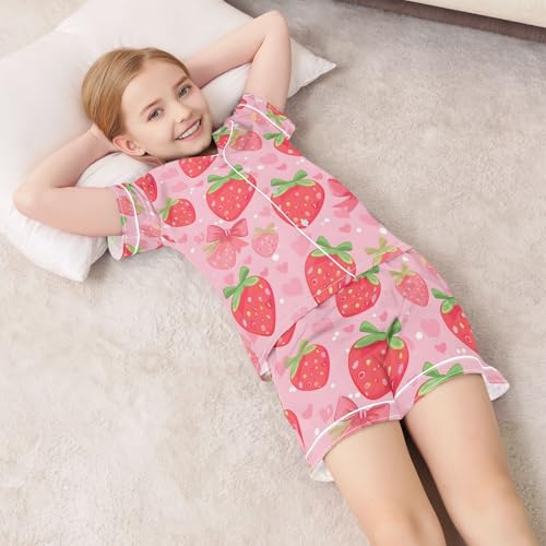 ALAZA Strawberry Love Heart Fruit Bow Pajamas Satin Pajama Set Short Sleeve Button Down Sleepwear 7