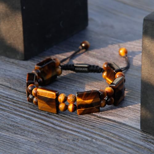 • 【EXCEPTIONALLY DESIGNED】Enhance your style with our UNIQUE cut tiger eye bead bracelet featuring a black “HASKARE” bead with woven drawstring inspired by the ancient Divine Guardianship. The square cut tiger eye beads, in pyramid and shield shapes, exude strength and wisdom and ward off evil intentions. It also has strong emotional healing properties, helping to alleviate fear and anxiety. This bracelet fits men with wrists measuring 18-19.8cm (7-7.79 inches).
