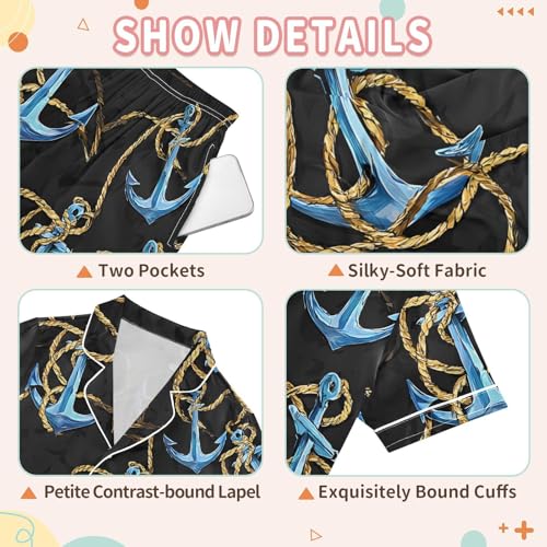 ALAZA Blue Anchor Black Satin Pajamas Set Short Sleeve Button Down Sleepwear Summer Pjs 2 Piece 6
