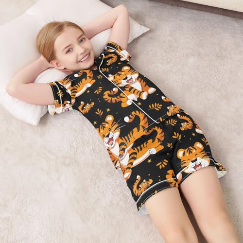 ALAZA Cartoon Tiger Animal Black Satin Pajamas Set Short Sleeve Button Down Sleepwear Summer Pjs 2 Piece 1