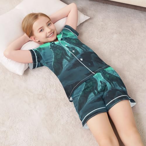 ALAZA Wolf Animal Night Green Satin Pajamas Set Short Sleeve Button Down Sleepwear Summer Pjs 2 Piece 1