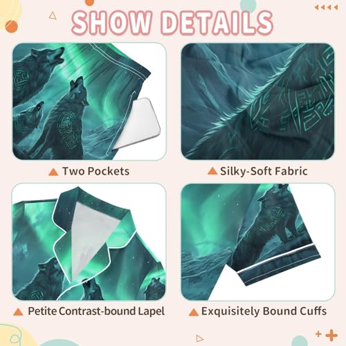 More information about ALAZA Wolf Animal Night Green Satin Pajamas Set Short Sleeve Button Down Sleepwear Summer Pjs 2 Piece