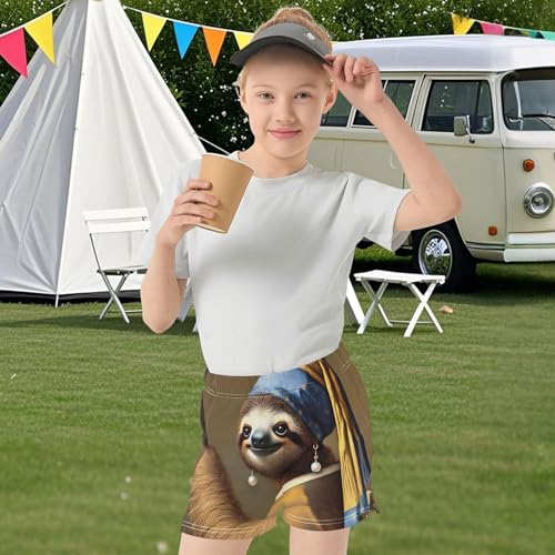 Girls Shorts Artistic Sloth Pearl Earring Print Cute Athletic Summer Activewear Pajama Shorts Teens Kids, X-Small 6