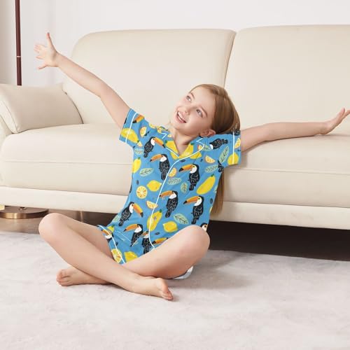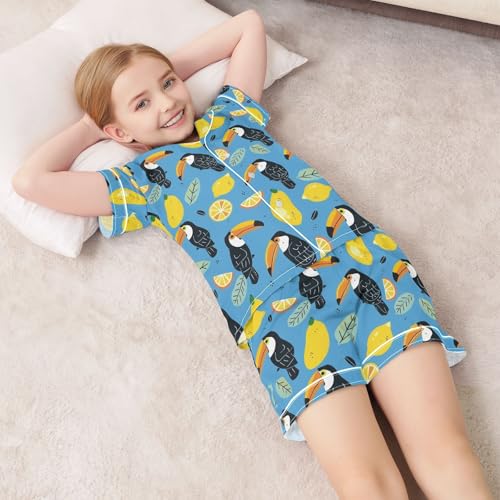 Cute Toucans and Lemons Summer Satin Pajama Set, Cute Button-Down Sleepwear Pj Set for Sleep Wears 1