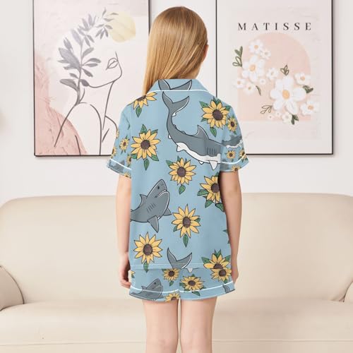 HOT ! senya Shark and Sunflower Satin Summer Pajama Sets Silk Short Sleeve Button Down Sleepwear