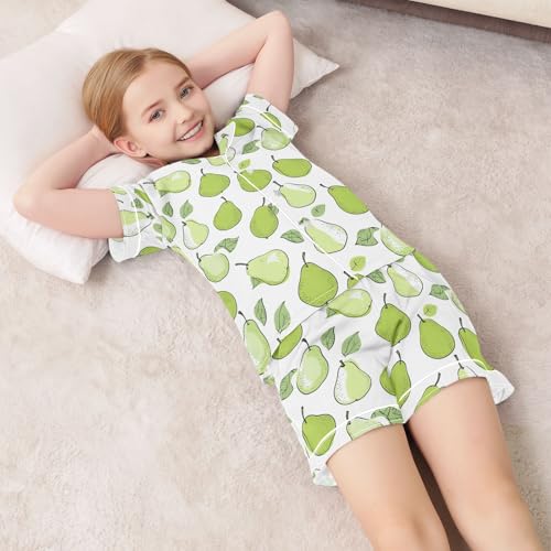 Cartoon Green Pear Summer Satin Pajama Set, Cute Button-Down Sleepwear Pj Set for Sleep Wears 1