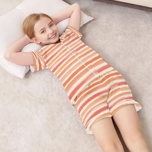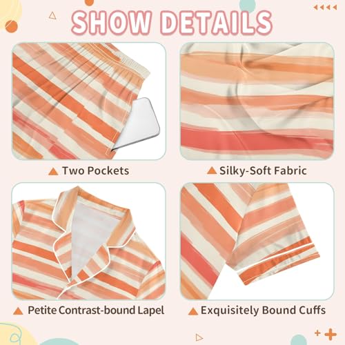 Cartoon Color Orange Strip Summer Satin Pajama Set, Cute Button-Down Sleepwear Pj Set for Sleep Wears 2
