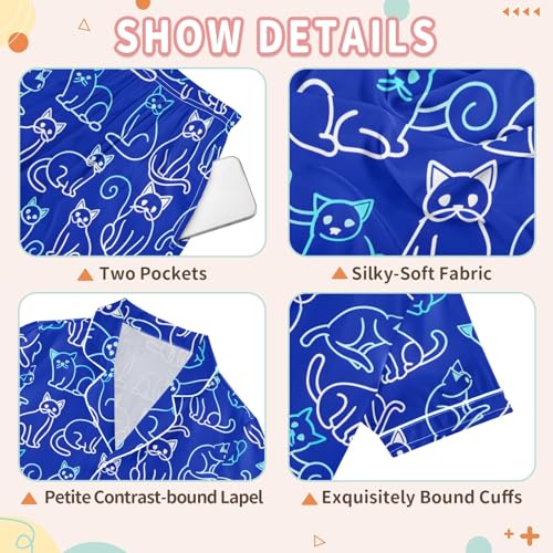 Navy Cartoon Cats Summer Satin Pajama Set, Cute Button-Down Sleepwear Pj Set for Sleep Wears 4