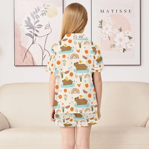 HOT ! senya Cute Capybara with Birds Satin Summer Pajama Sets Silk Short Sleeve Button Down Sleepwear